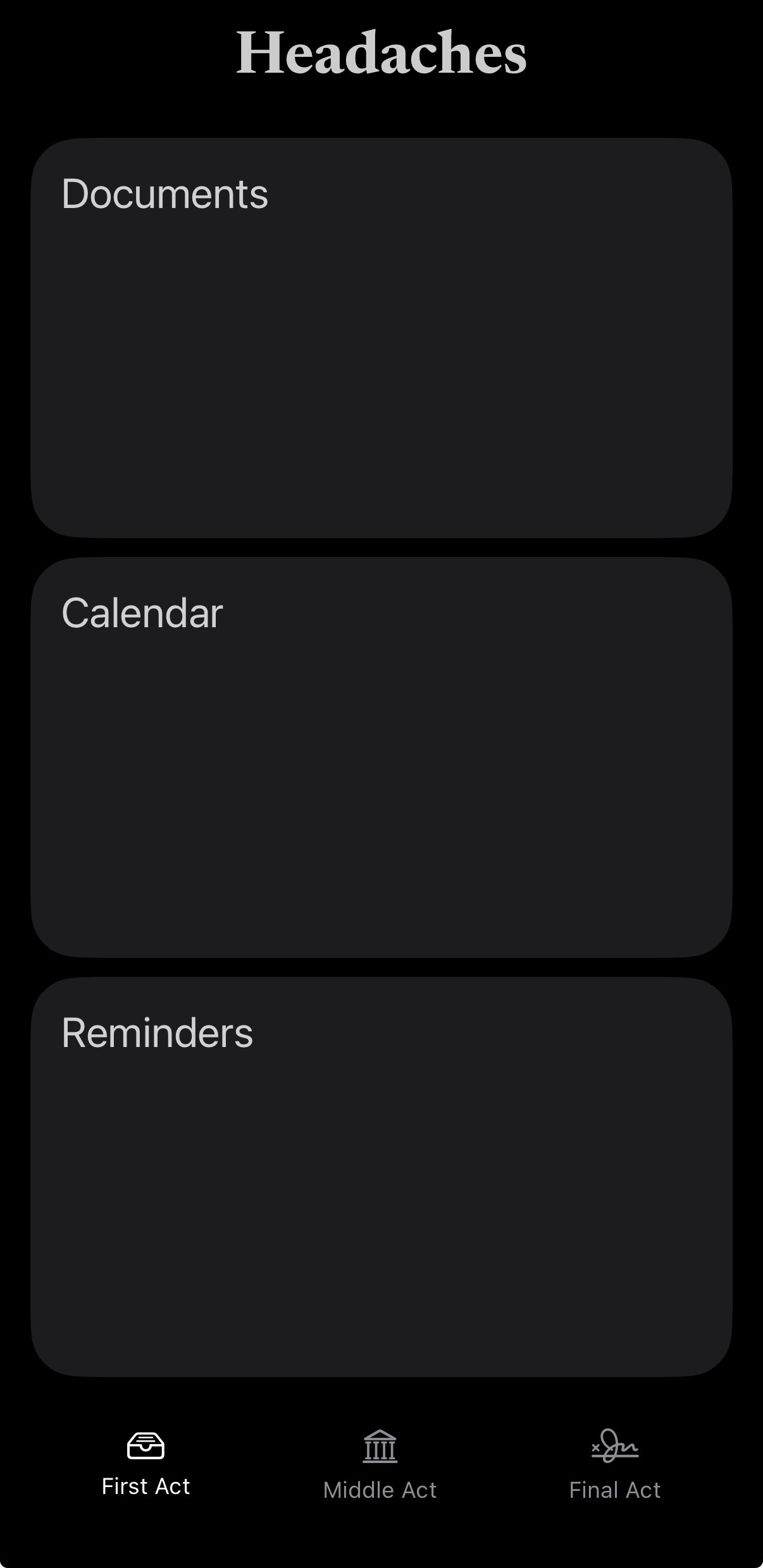 Life doesn't scatter your responsibilities — it multiplies them. Documents to store. Dates to remember. Tasks that refuse to wait. Headaches brings them together in one focused, private space. Organize critical documents, track important calendar events, and stay ahead with reminders — all within a clean, distraction-free interface built for clarity. When everything that demands your attention lives in one place, the chaos quiets — and the headaches finally feel manageable.